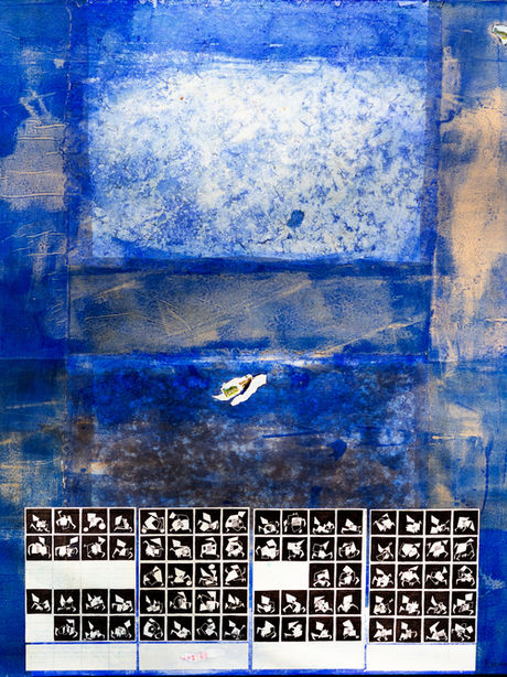 L'encre bleue des lettres d'Apostolos se fond dans le bleu de la toile qui retient des bribes de texte délavé. Jamais la peinture n'avait été aussi proche des mots et de leur histoire à travers les langues aimées par l'auteure.